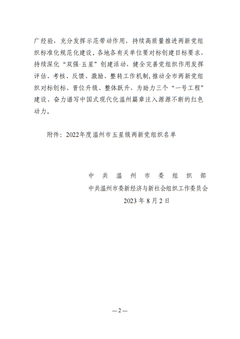 關(guān)于公布2022年度溫州市五星級兩新黨組織創(chuàng)建結(jié)果的通報
